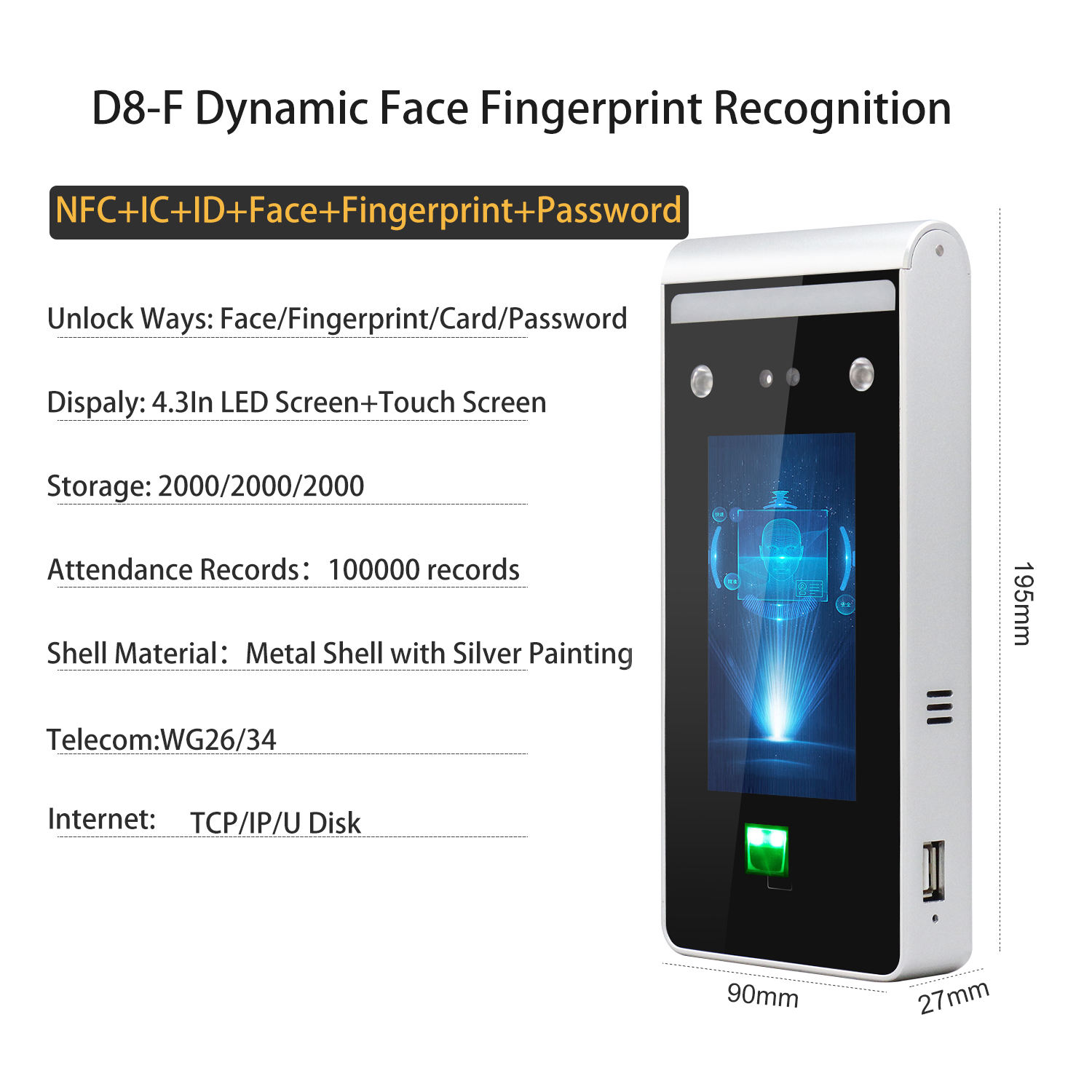 This advanced face recognition terminal provides fast and accurate biometric identification for attendance tracking and access control. The dual-camera system ensures reliable performance in various lighting conditions, while the 8-inch touchscreen offers intuitive operation. Suitable for offices, factories, schools, and other organizations requiring secure access management.